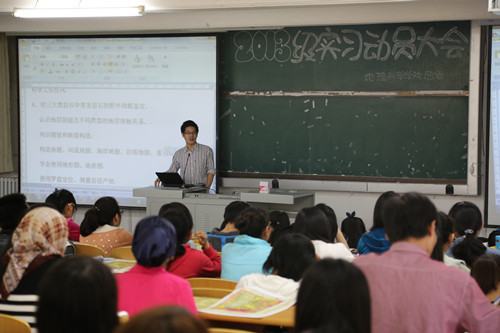 本次大会主要给即将参加地理科学学院野外地理实习的2013级同学们介绍实习过程中需要准备的专业知识、实习工具、生活用品以及实习经验等。大会首先有请李鸿凯老师讲述本次实习的地点、路线、观察的地质地貌类型等。李鸿凯老师用其丰厚的实习经验、扎实的专业知识给2013级同学们的实习做了充分的动员工作。同学们积极性高涨,掌声一次又一次在会场响起。接着分别由杜明武同学、李新月同学从生活方面给即将参加实习的同学们做了实习介绍,并且很好地解答了同学们提出的各种问题。然后由刘伟同学给人文地理专业的同学们介绍人文地理实习过程中的注意事项。这三位优秀的学长学姐都将自己的实习经验分享给同学们,得到同学们的一致好评。最后,团委实践部部长卢亚昆同学对“第二届实习摄影大赛”和“暑期社会实践”这两个活动做了介绍和宣传。