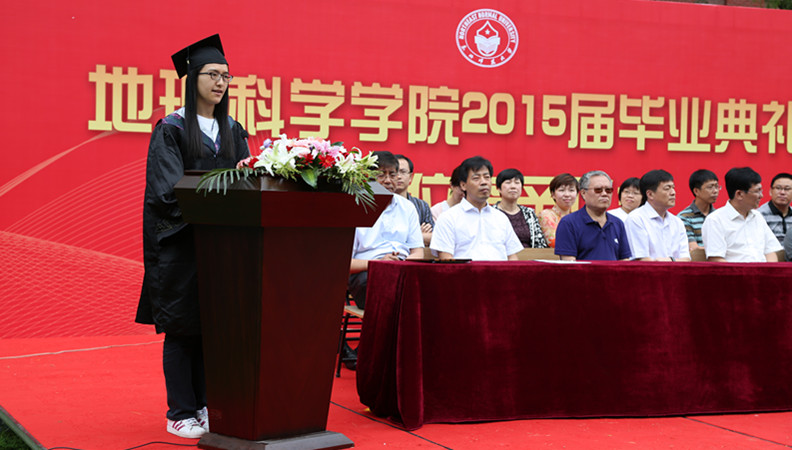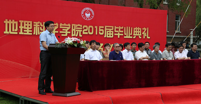 毕业典礼上,副院长卜兆君宣读了《地理科学学院2015届本科生、硕士研究生、博士研究生毕业和授予博士学位、硕士学位、学士学位的决定》。副书记兼副院长陈静宣读了《地理科学学院关于2015届毕业生评优表彰的决定》。