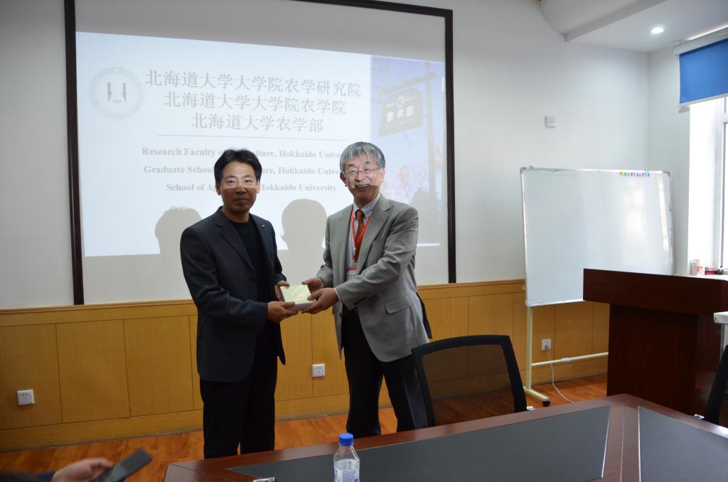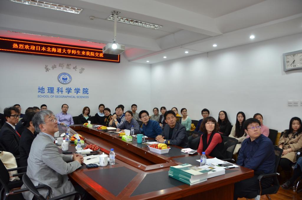 卜兆君副院长首先表达了对井上京副院长一行的欢迎,并简要介绍了地理科学学院自建院以来的发展情况。井上京副院长回顾了两院之间的合作交流历史,对我院的热情接待表示感谢,并对双方多年来的合作表示赞赏。双方商定,今后会在相关专业进行更进一步的交流互访,也会在研究生联合培养等方面积极开展切实深入的合作。会上,王秀峰副教授还详细介绍了北海道大学农学院的具体情况。会后,6名农学部学生以海报的形式展示了他们最新的研究成果,并与我院师生进行了热烈的讨论。