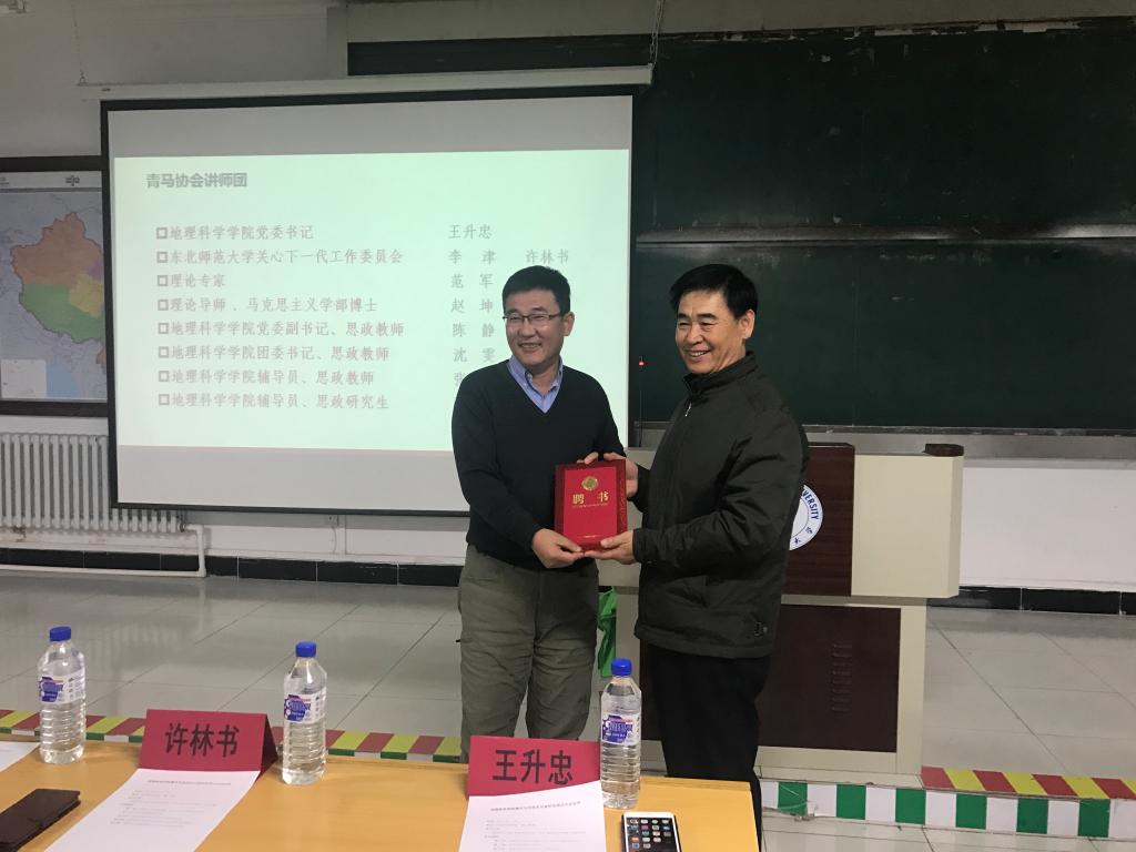 开班仪式由学院团委书记沈雯主持,学院党委副书记陈静代表学院党委致辞,阐述了青马学会在学院学生培养和思想教育工作中的定位与作用。学院党委书记王升忠为讲师团代表许林书颁发了聘书,并作了题为“传统与创新:东师地理学人的精神脉络”的首场报告。