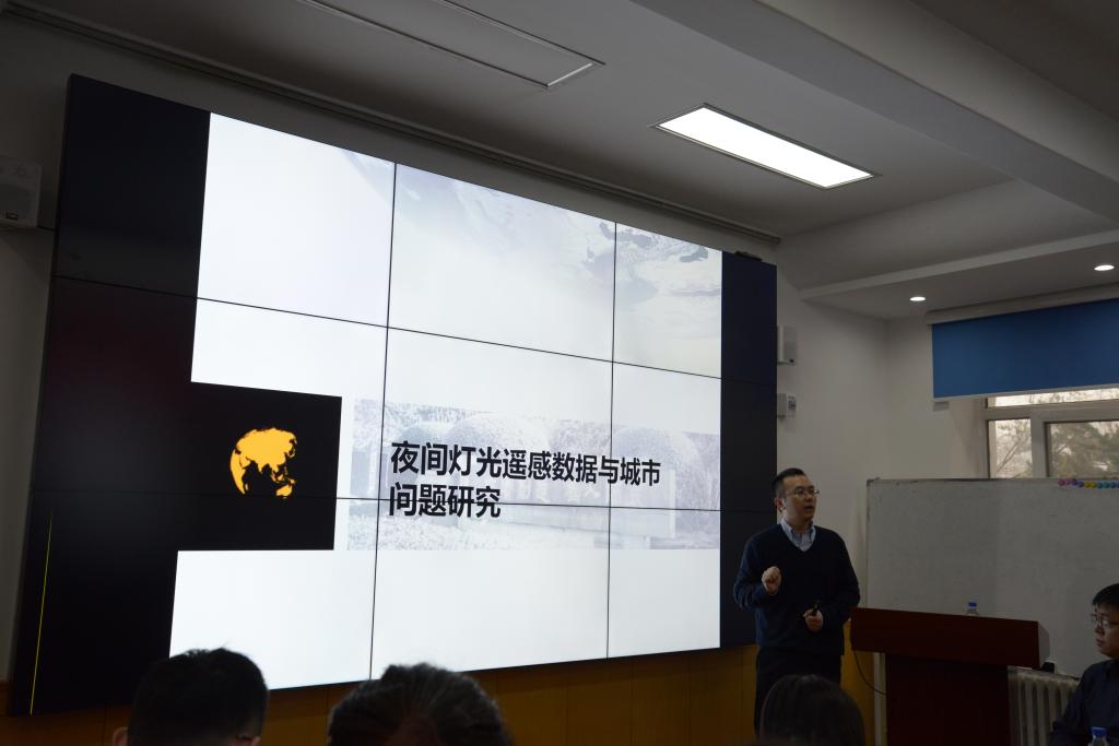 报告中,余柏蒗教授介绍了夜间灯光的主要数据获取来源、夜间灯光在城市研究中的应用方向,以及其团队近几年在利用夜间灯光遥感数据研究城市问题中的最新进展。阐述了夜间灯光数据研究城市化进程在城镇空间上的体现(物理属性),如城市建成区的提取、城市内部空间结构和城市群空间结构的分析等;列举了夜间灯光数据描述城市化进程在社会经济结构上的体现(社会属性),如多种社会经济指标(GDP、电力消耗、货运总量、碳排放等)的估算、城市住房空置率估算、综合贫困指数估算等。报告结束后,余柏蒗教授同与会师生就夜间灯光数据的采集方法、噪声去除、未来可能的新领域和新方向等问题进行了热烈交流和深入探讨。