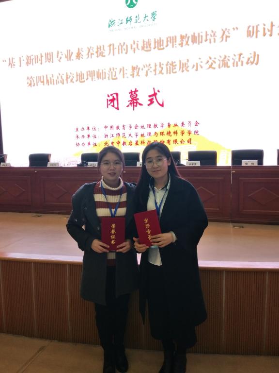 近日,第四届全国高校地理师范生教学技能大赛在浙江师范大学举行,我院2014级本科生赵黎(指导教师:娄晓黎,刘春玲)获得“一等奖”, 2015级研究生穆雪莹(指导教师:王向东,董姝娜)获得“二等奖”。