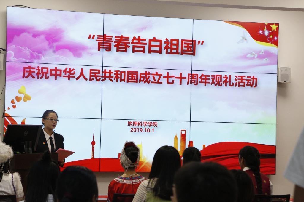 地理科学学院于2019年10月1日9:30举办了庆祝中华人民共和国成立七十周年阅兵观礼活动,教师代表、本科生、研究生共150余人参加了观礼活动。