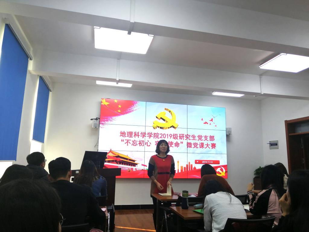 11月14日,2019级研究生党支部开展了“不忘初心、牢记使命”主题微党课大赛,学院党委副书记陈静、团委书记沈雯、本科生党支部书记雷钧婷担任了本次比赛的评委。