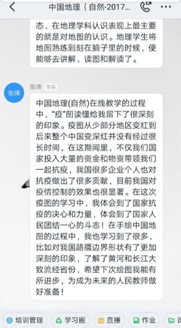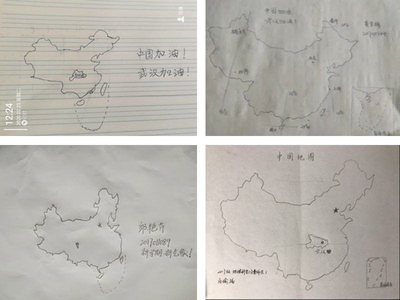 尽管防疫期间无法为提供学生如智慧教室涂写墙般充分展示的机会,但同学们在家里依然运用专业的地图素养,饱含情感、饱含想象地绘制一幅幅地图,运用钉钉平台在线共享作业,真切表达了对伟大祖国的深切爱意,充分书写了对未来地理教师的职业规划和从业期待。