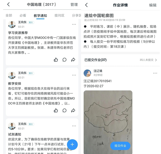 通过钉钉平台的学习圈、作业等栏目及时布置学习任务,学生在线提交作品,教师及时点评,实现师生之间、生生之间深度交互。以速绘中国地图为例,任务布置后,课后学生将绘图发到钉钉作业群中,师生进行广泛交流。