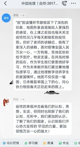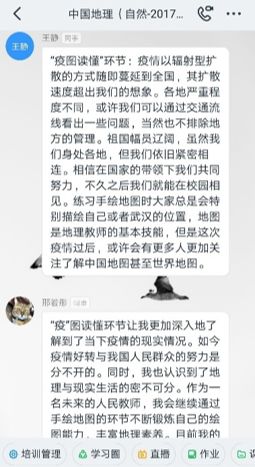 教师在钉钉平台上展示全国新冠肺炎疫情分布图,引导学生思考:你看到了什么?想到了什么?你为什么感动?又为什么彻夜难眠? 学生通过钉钉平台连麦功能,可以主动申请进行交流。此时身处全国各地学生的连线,更能体现出地理学科的区域特点。