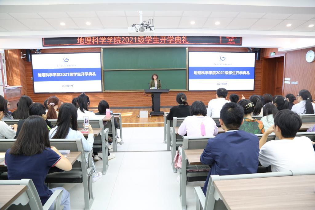 9月14日,地理科学学院2021级新生开学典礼在地理大教室隆重举行。地理科学学院党政班子、学院教师代表、学工组老师和2021级新生参加了此次活动。典礼由学院党委副书记、副院长陈静主持。