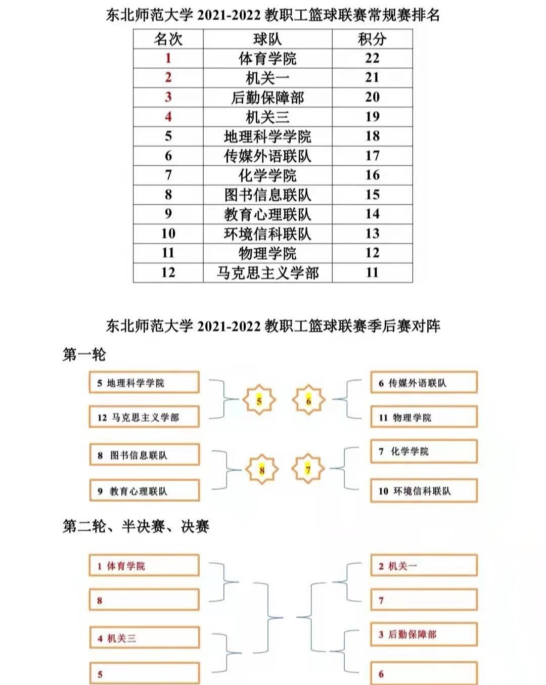 经过近3个月的赛程,2021-2022年东北师范大学教职工篮球比赛常规赛阶段全部结束,地理科学学院篮球代表队经过11场比赛的激烈角逐,取得全校第五名,位列全校12支参赛中的学院队伍之榜首,是近十年参加比赛获得的最好成绩。