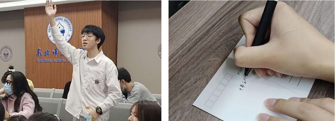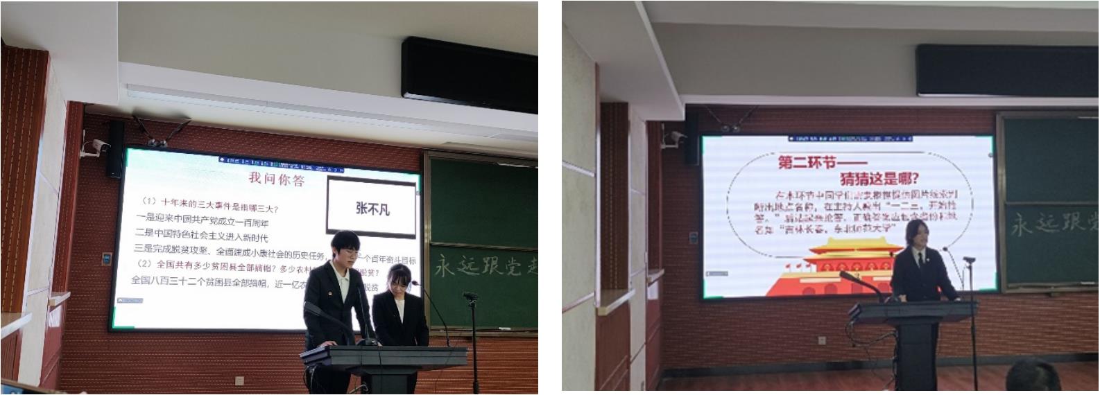 本次团日活动通过理论宣讲、视频学习、问题竞答等形式,引导广大团员学习党的二十大精神。在理论宣讲方面,本次活动选取了党的二十大报告中与同学们较为密切相关的“实施科教兴国战略,强化现代化建设人才支撑”内容,由一班和三班团支部负责,通过宣讲引导大家进一步明确了自身的使命与责任。紧接着由二班和四班团支部讲解党十年以来完成的三件大事,通过随机抽签的方式有奖提问,积极与线上线下同学互动,充分调动了大家参与的积极性。在视频学习方面,组织大家观看一个个平凡人在十年中不平凡的奋斗故事,引导同学们回顾与展望自己的十年,立下十年之约,每个人给自己写一张明信片,进一步引导大家不忘初心。在党史竞答环节,以广为人知的优秀榜样人物、经典红色景物和事件为题面,同学们在回答中回望党的历史,感受红色精神。大家踊跃抢答,现场气氛热烈。激动地抢答意犹未尽,熟悉的《歌唱祖国》的旋律响起,领唱人依次在教室四处进行领唱,同学们自发地打起拍子,进行合唱,美好旋律在地大教室久久回响。
