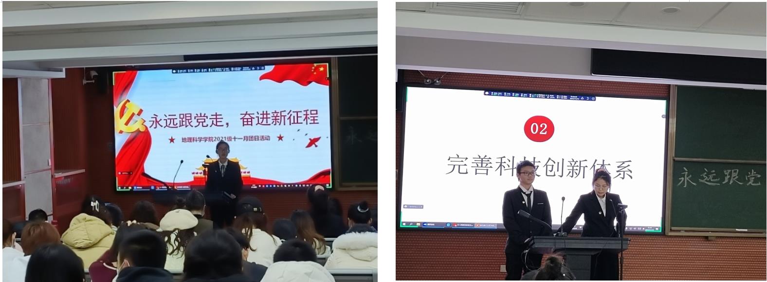 11月13日,地理科学学院2021级本科生举办了以“永远跟党走,奋进新征程”为主题的团日活动。地理科学学院团委书记赵琳、2021级辅导员张婧宁、2021级全体本科生参加本次活动。