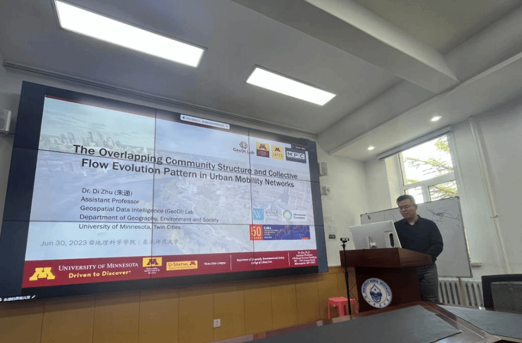 6月30日,明尼苏达大学地理环境与社会系助理教授朱递博士应地理科学学院邀请,为学院师生作了“城市人类移动性网络下的重叠社区结构和集体流演化模式”的学术报告,吸引了人文地理学、城乡规划学、地理信息科学等不同专业的学生约40余人参加。