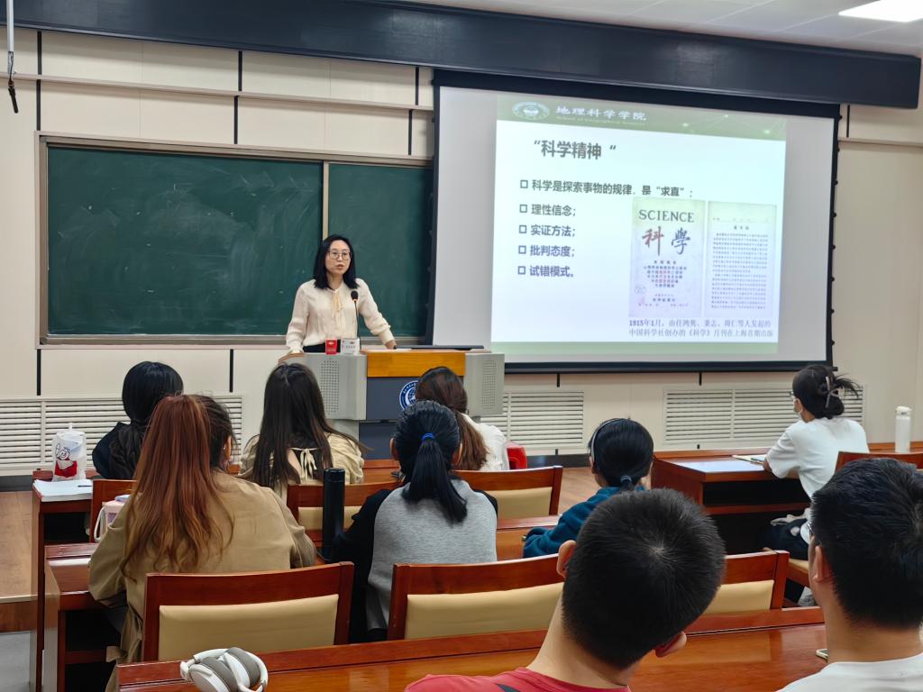 9月13日,地理科学学院在报告厅举办“院长讲授思想政治理论课”活动,学院院长、博士生导师白娥教授以“科学精神与人文素养”为题,为本科生呈现了一堂意义深远的思想政治理论课,为本科生的未来发展与科学研究指明了方向。