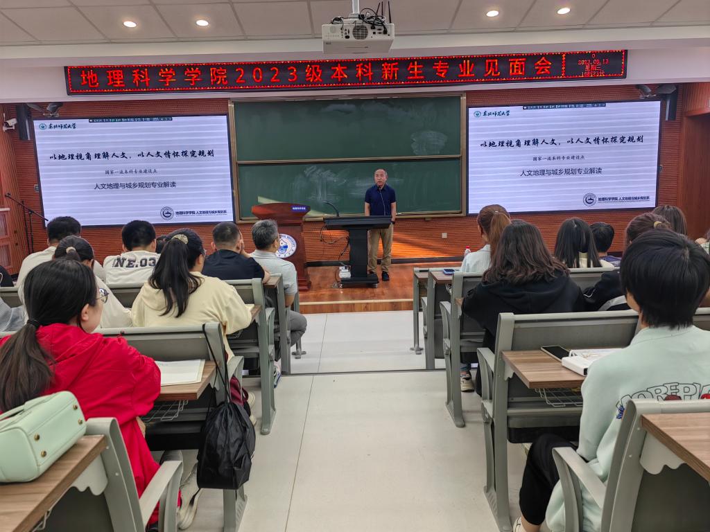 2023年9月13日,我院在地理大教室针对2023级本科新生进行了专业解读见面会。地理科学(公费师范)专业系主任娄晓黎、自然地理与资源环境系主任宗盛伟、人文地理与城乡规划系主任王昱、地理信息科学党支部书记赵建军四位老师应邀为同学们进行专业解读。会议由党委副书记兼副院长杨成岭主持。