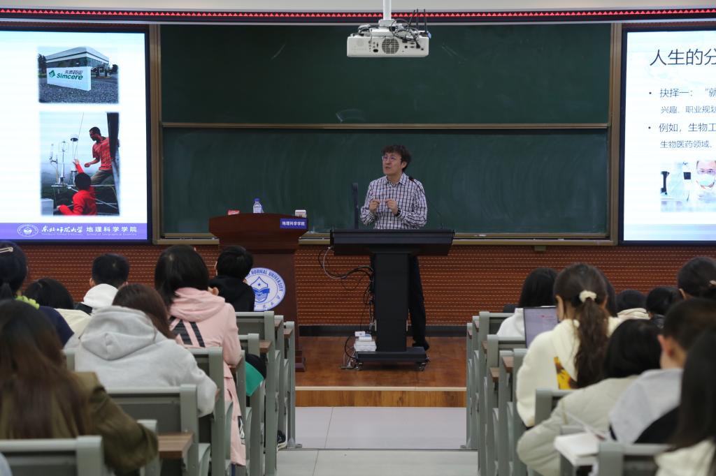 本次活动中,王猛以“地理探秘者的修行之路”为题讲述了在困难中磨砺自身,在超越中逐渐成长、追逐梦想的经历,激励同学们基于兴趣规划未来发展。张婧以“回归‘附近’——身边的地理学”为题介绍了如何从身边的环境和人汲取“养分”,引导同学们关注周围事物的变化,回归到真实社会当中。