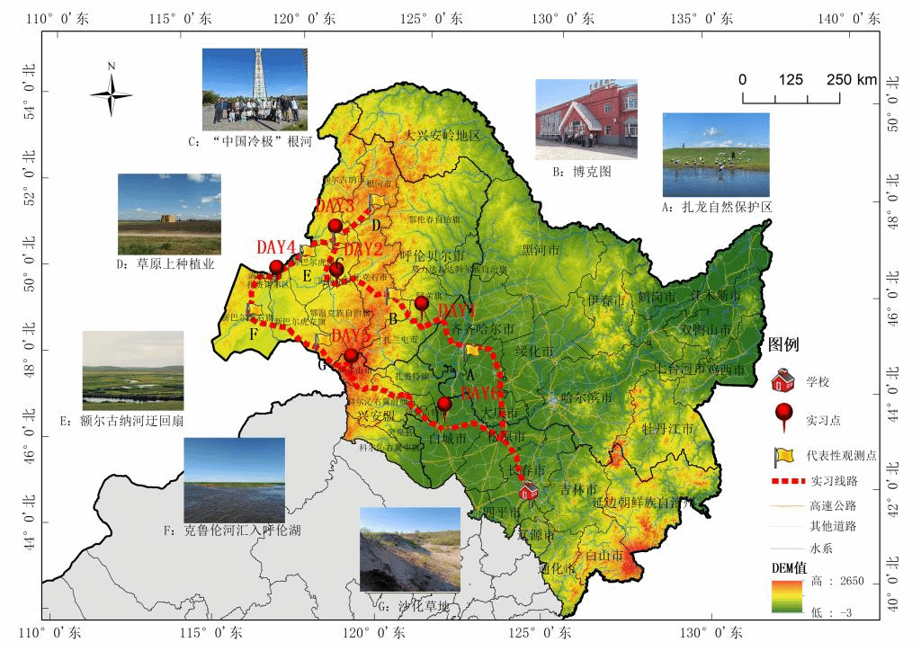 2024年8月26日至9月1日,地理科学学院2021级基地班同学在李鸿凯、陶岩、王昱、陈彦四位老师的带领下,开展了区域地理综合实习。本次实习穿越松嫩平原、大兴安岭、呼伦贝尔高原等典型地理区域,认识了温带草原、寒温带森林等地带性植被及其过渡变化,深入内陆口岸城市(满洲里)、人口收缩城镇(博克图)、旅游城市(额尔古纳)和中东铁路旧址等人文地理景观,游历了扎龙湿地、中国冷极(根河)、额尔古纳河、呼伦贝尔草原、呼伦湖、阿尔山、边境公路G331等代表性地理单元,实习线路横跨中国地势的第三和第二阶梯、半湿润区和半干旱区,集成了丰富的地理要素和多样的地理过程。