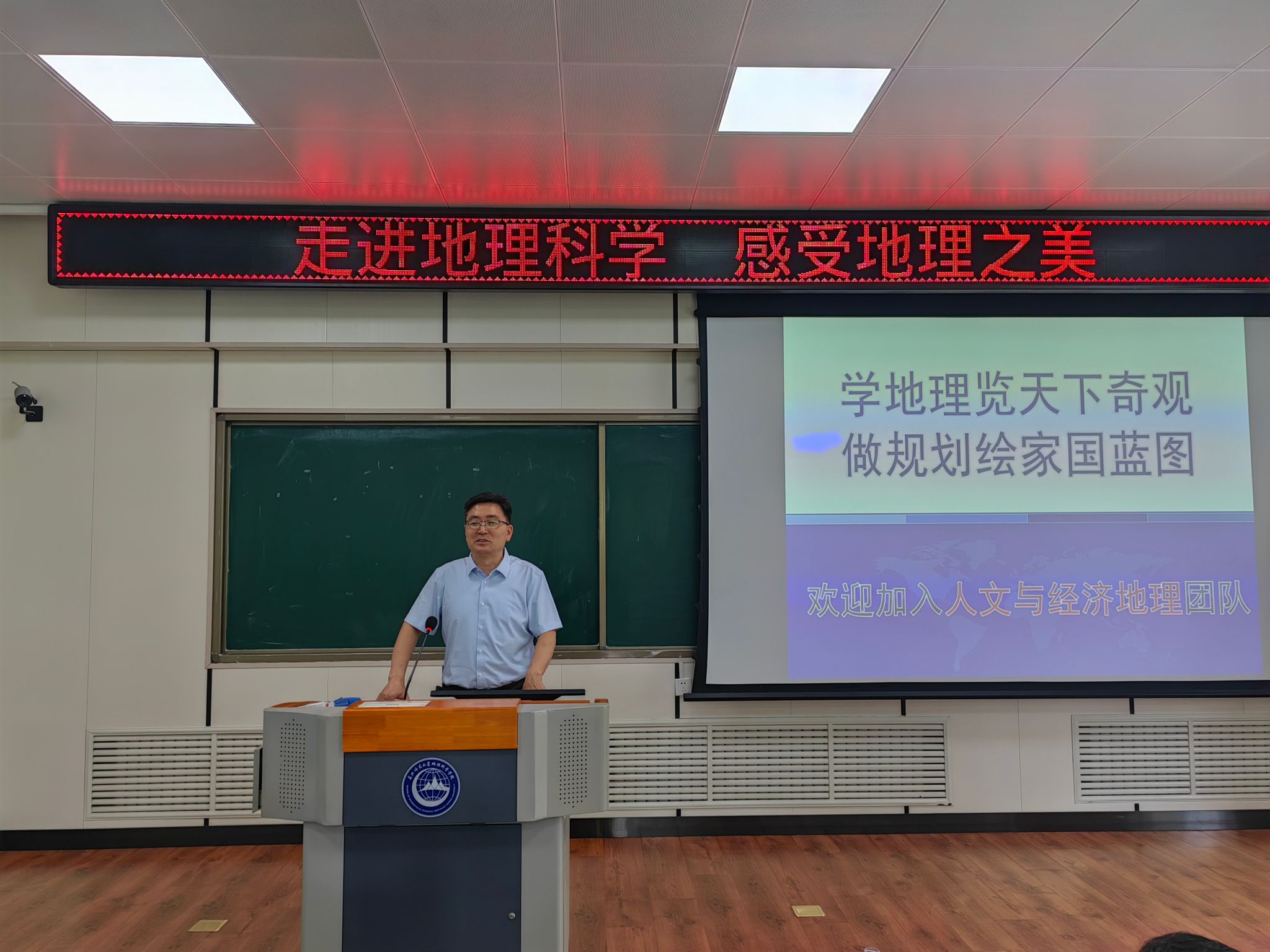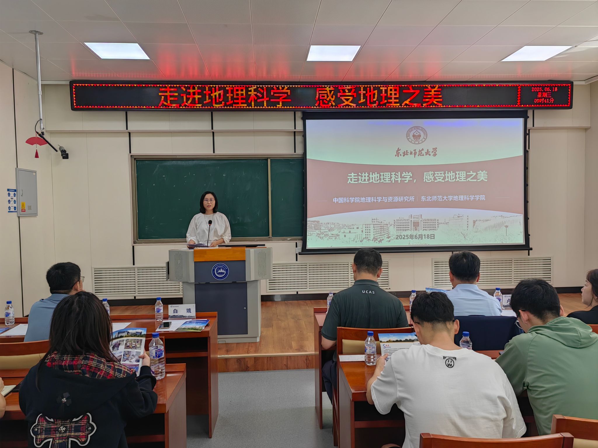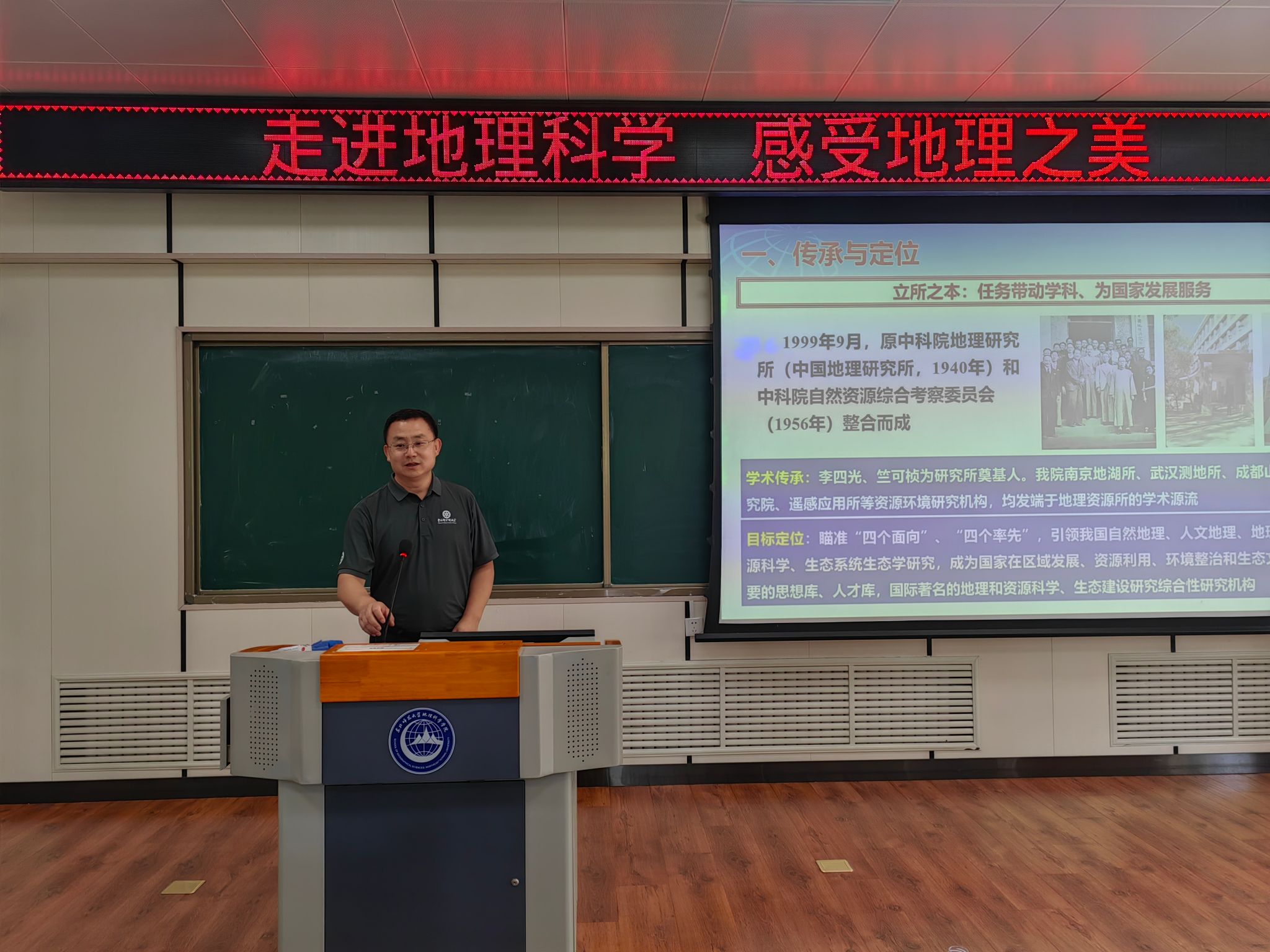 6月18日,为提升本研高水平升学质量,推进拔尖创新人才培养,帮助学生了解科研院所发展情况及研究生招生政策,中国科学院地理科学与资源研究所(以下简称“地理资源所”)在我院举办2025年“走近地理科学,感受地理之美”招生宣讲会。地理资源所教育处处长王振波、人文与经济地理团队张文忠、自然地理研究团队卢宏玮、以及教育处杜相品、胡燕子等5位老师组成的专家团队进行宣讲,活动由院长白娥主持,学院副书记兼副院长宋飏、教师魏冶、房艳刚、王昱、李晓玲、2023级本科生辅导员姚佳、及学院本科生研究生学生共百余人参加。