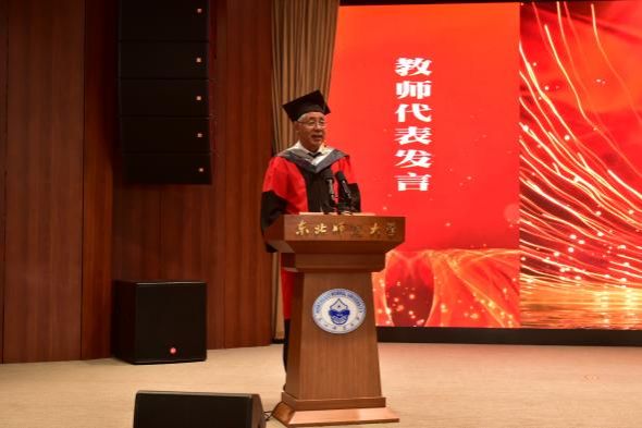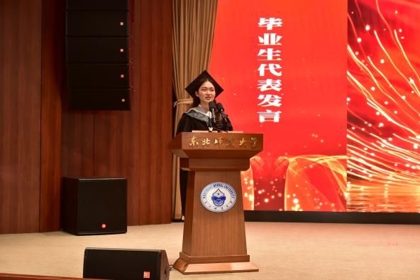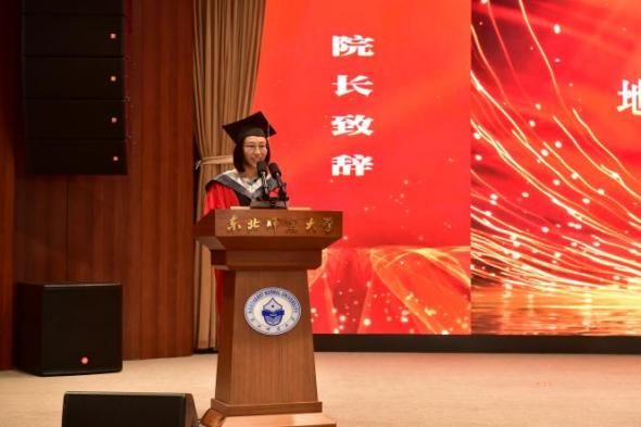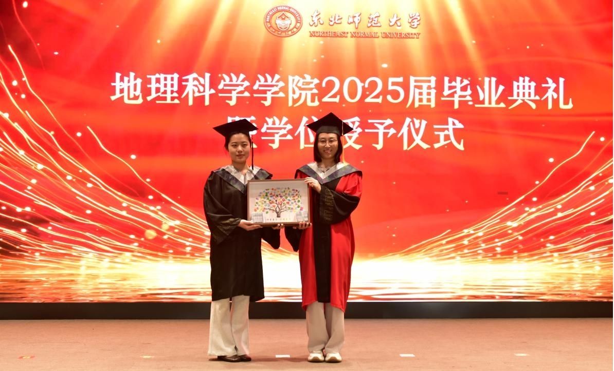 教师代表吴正方教授在发言中首先对全体毕业生顺利毕业表达了热烈的祝贺,将“教书育人”“巧夺天工”和“家国天下”三个关键词赠予毕业生,希望地理学子在未来的工作和学习中要坚守教师言传身教的育人宗旨、追寻自然之美并尊重自然规律、秉承地理学和地理学者的情怀与责任担当,并对毕业生送上了“人生精彩、前程锦绣”美好的祝福。2025届地理科学专业本科生王名扬代表全体毕业生上台发言,她回顾了自己的成长历程,表达了对学院领导、老师和同学们的感激之情,表示地理全体毕业生将牢记学院的教诲,以饱满的热情和坚定的信心迎接未来的挑战,努力实现自己的人生价值,为党和国家做出地理人应有的贡献。之后,2025届本科毕业生为学院献上印有毕业生指纹“大树”象征意义的纪念品。