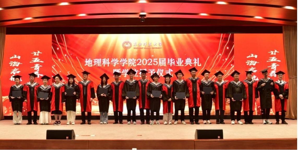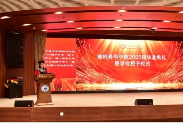 典礼在庄严的国歌声中拉开帷幕。地理科学学院院长白娥教授宣读关于准予2025届本科生、硕士研究生、博士研究生毕业并分别授予学士、硕士、博士学位的决定。在学位授予仪式上,学院学位评定分委员会集体为获得博士、硕士和学士的毕业生授予学位、正冠拨穗。这一庄严的仪式标志着同学们正式完成了学业,开启了新的人生篇章。