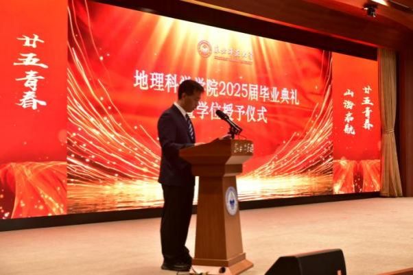 6月25日,地理科学学院2025届学生毕业典礼暨学位授予仪式在学校惟真楼二楼报告厅隆重举行。学院党政领导班子、学位评定分委员会成员、学院教师代表、学生工作组全体老师、2025届毕业生及其亲友共同见证了这一难忘的时刻。活动由学院党委书记卜兆君教授主持。