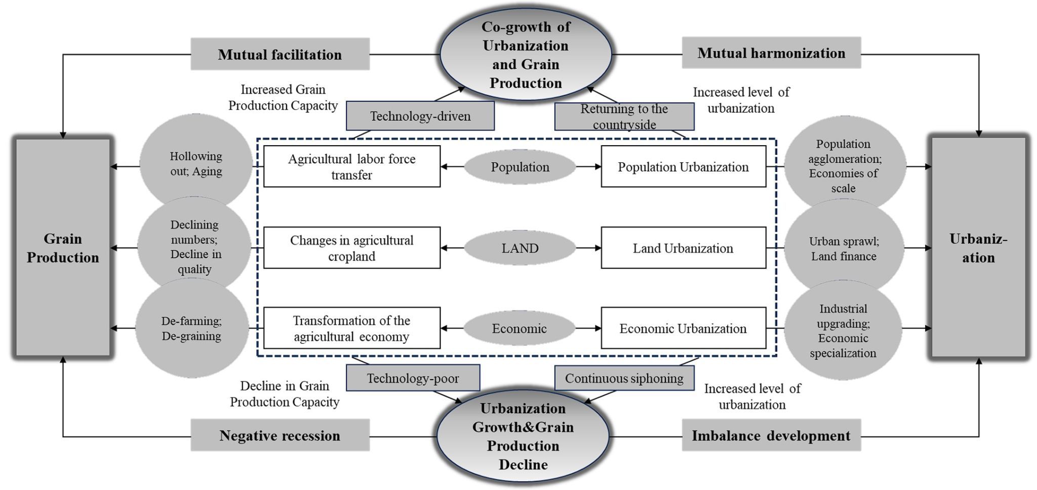 城市地域系统的演变带来了显著的资源环境效应,团队主要聚焦于粮食安全和碳排放两个重要的效应维度展开深入研究。在粮食安全方面,团队基于系统科学理论,系统实证测度了2000—2022年城市地域系统与粮食生产系统的多维耦合格局、动态耦合过程,并据此初步总结了中国语境下二者的复杂耦合机制,以期为中国城镇化与粮食生产高质量协调发展提供科学参考。在控碳降碳方面,团队聚焦于城市收缩这一城市地域系统演变的新现象,将中国667个城市划分为持续收缩、精明收缩、持续增长和潜在收缩四种发展模式,并创新性地采用贝叶斯优化XGBoost模型结合SHAP可解释方法,系统识别了影响碳排放强度的关键驱动因子。相关研究成果1以“21世纪以来中国粮食生产能力空间重构过程与驱动机制”为题,发表在《自然资源学报》上。相关研究成果2以“Coupling of urbanization and grain production: patterns, processes, and mechanisms—A case study from china”为题,发表在FRONTIERS IN SUSTAINABLE FOOD SYSTEMS上。相关研究成果1和2第一作者均为我院博士生常晓东,王士君教授为通讯作者。相关研究成果3以“Exploring the nonlinear effect of population shrinkage on carbon emission intensity in Chinese counties using an interpretable XGBoost model”为题,发表在Applied Geography上。相关研究成果4以“Spatiotemporal patterns and nonlinear drivers of carbon emission intensity under urban shrinkage and growth: A machine learning approach with interpretability”为题,发表在Sustainable Cities and Society上。相关研究成果3和4第一作者均为我院博士生谢铭堁,冯章献副教授为通讯作者,王士君教授为合作作者。