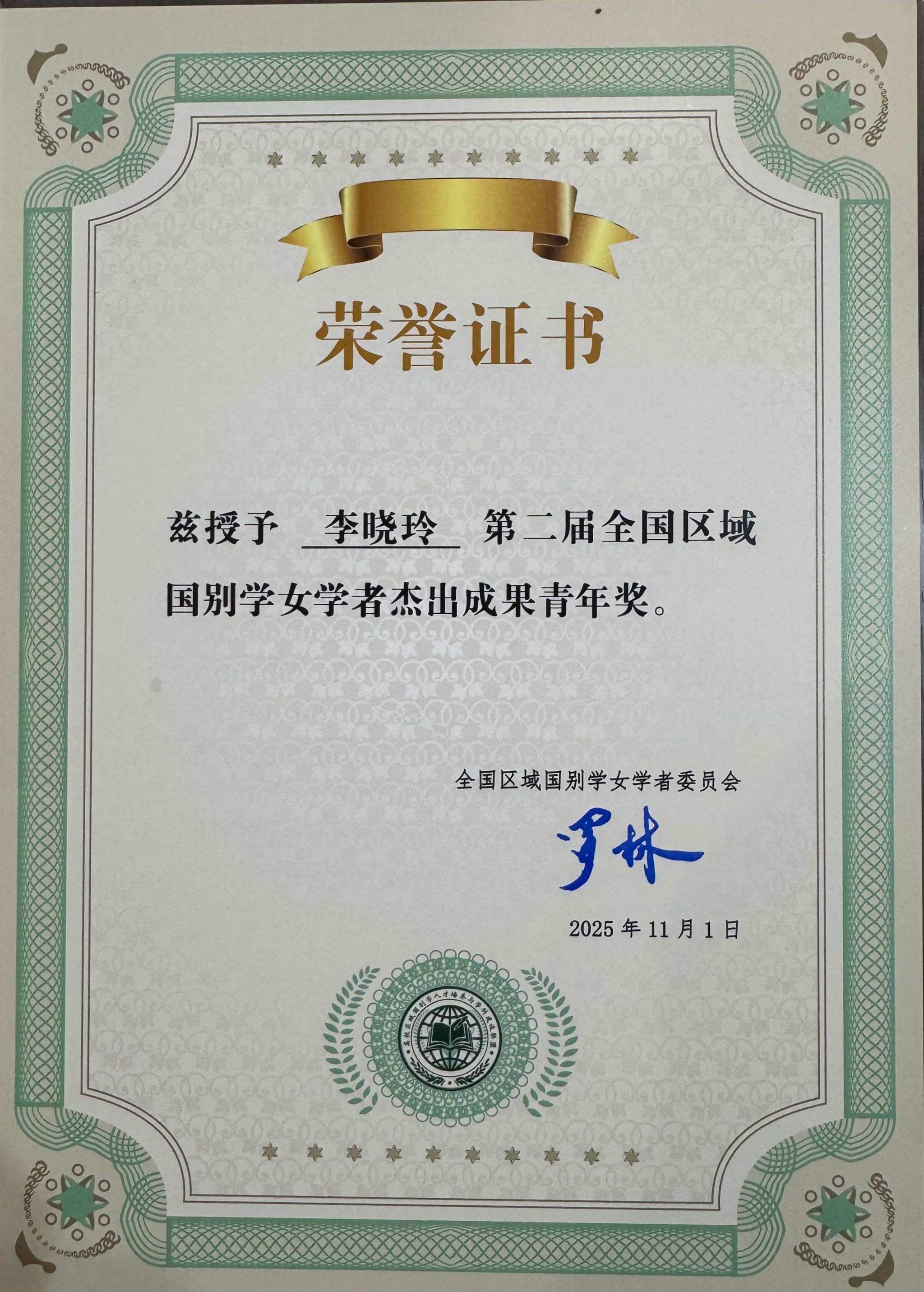 11月1日-2日,高校区域国别学人才培养与学科建设联盟第七届年会在浙江杭州召开,此次会议由教育部国别和区域研究工作秘书处、高校区域国别学人才培养与学科建设联盟、浙江工业大学主办,浙江工业大学区域国别研究院等单位承办。会上举行了第二届“全国区域国别学女学者杰出成果奖”颁奖仪式。经过多学科专家评审,我院李晓玲副教授荣获“全国区域国别学女学者杰出成果青年奖”。