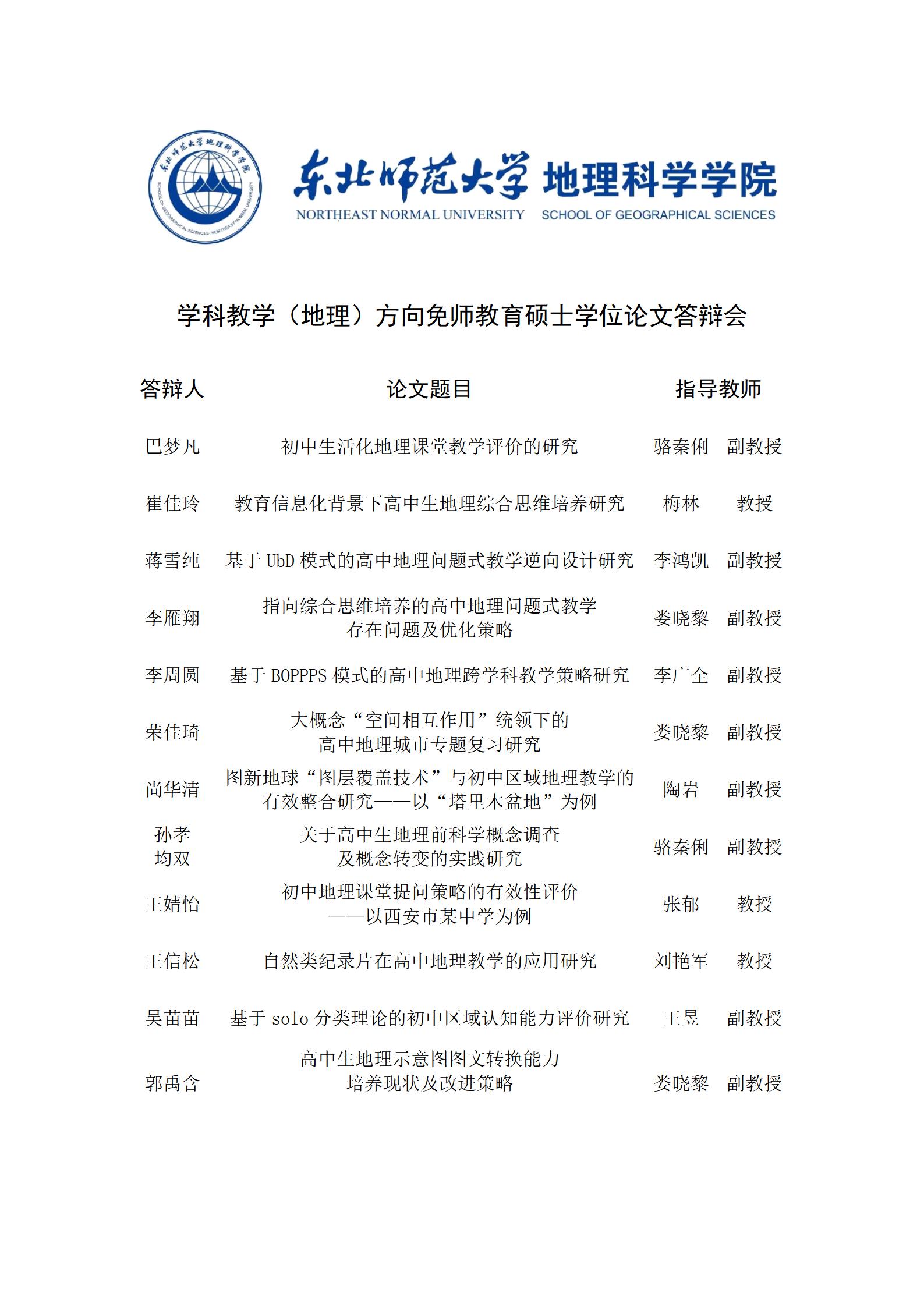 【硕博答辩】学科教学(地理)方向免师教育硕士学位论文答辩会