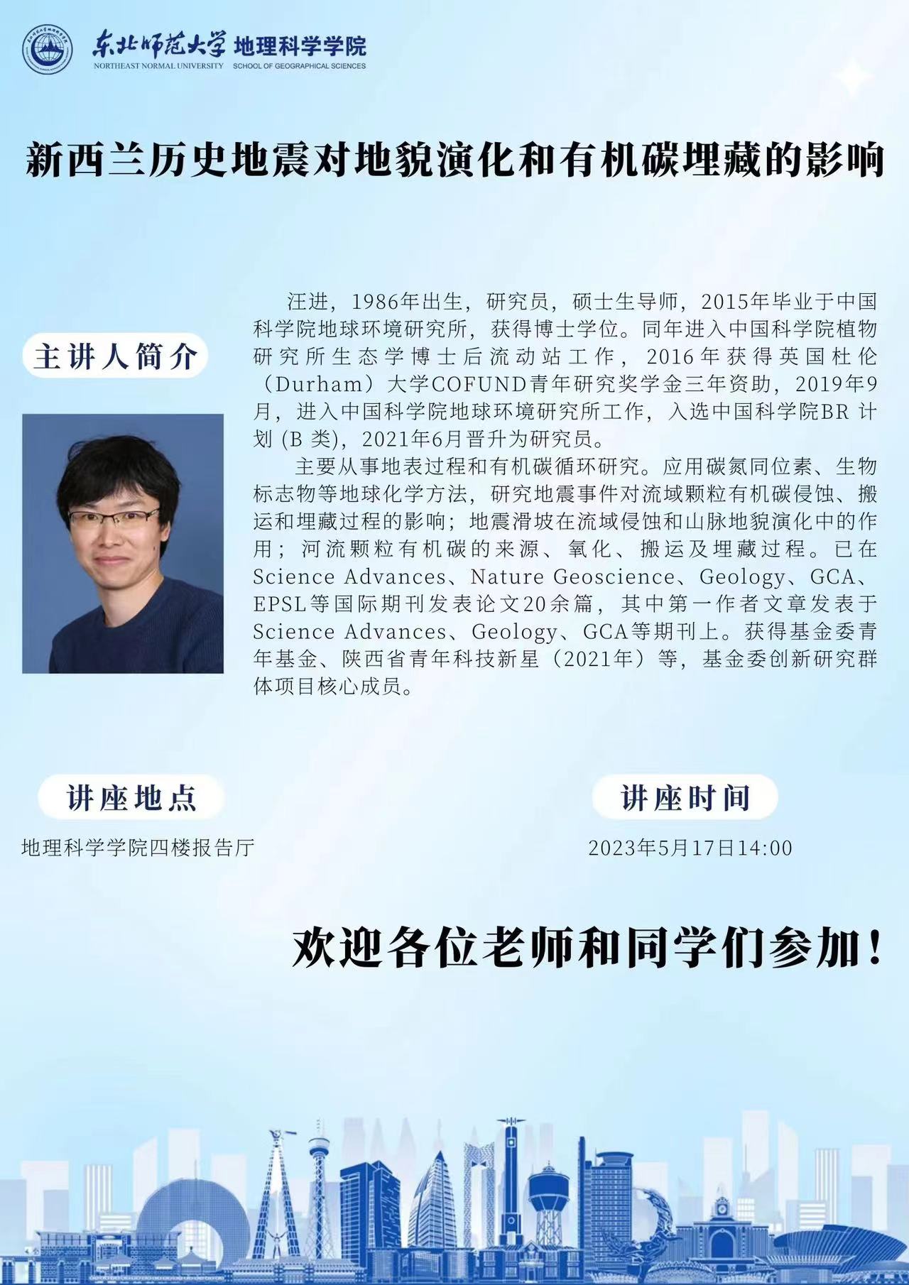 【学术报告】汪进:新西兰历史地震对地貌演化和有机碳埋藏的影响