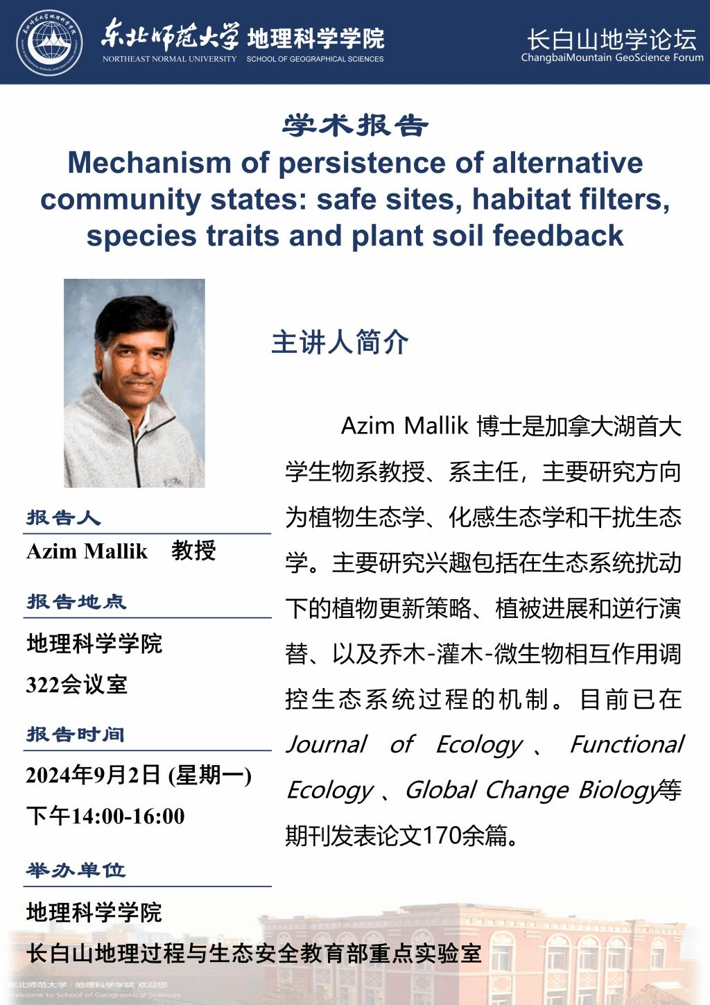 【长白山地学论坛(第十期)】Azim Mallik: Mechanism of persistence of alternative community states: safe sites, habitat filters, species traits and plant soil feedback