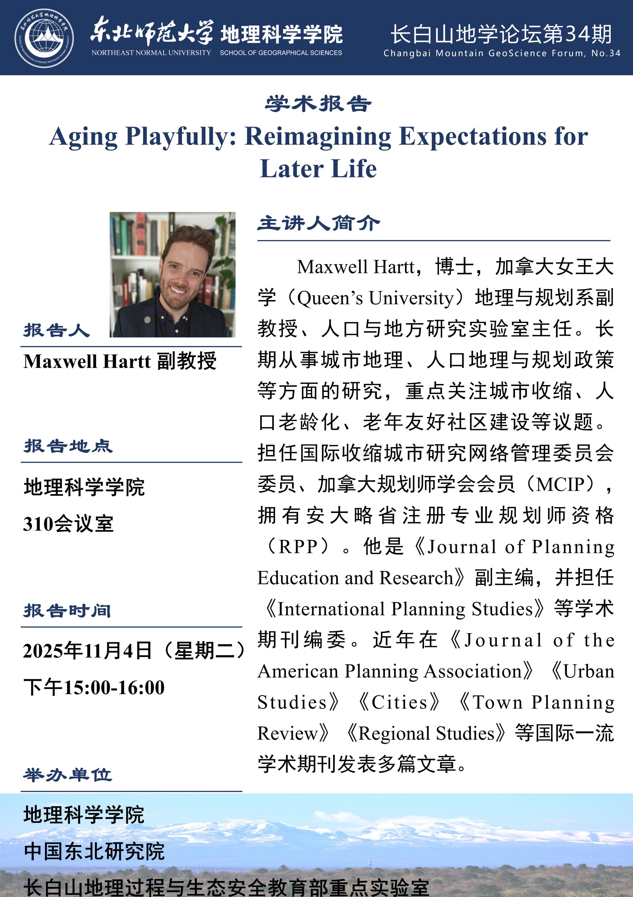 【长白山地学论坛(第三十四期)】Maxwell Hartt:Aging Playfully: Reimagining Expectations for Later Life