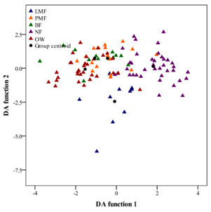 图1. 不同植物群落下表土植硅体判别分析散点图