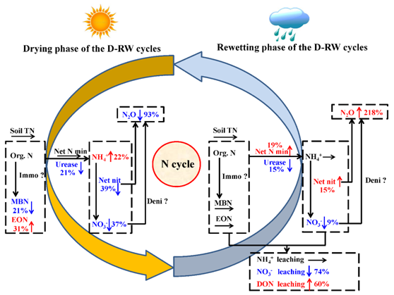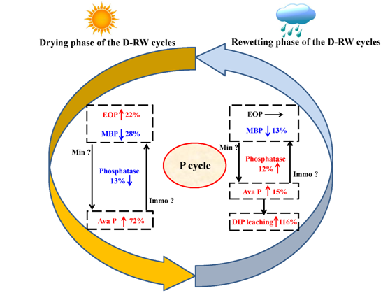 气候变化会引起降水格局发生改变,从而导致干湿交替模式发生改变,进而可能会影响陆地生态系统中土壤氮、磷循环。土壤干旱会抑制土壤微生物活性,并且随着干旱强度的增加,土壤微生物和根系可能会死亡。随后的再湿润会通过破坏土壤结构、从土壤矿物表面解吸有机和无机氮和磷、对土壤微生物施加渗透压以及改变根系生长等途径影响土壤养分循环。由于土壤氮和磷在陆地生态系统中起着至关重要的作用,因此全面了解其对干湿交替的响应变得越来越重要。