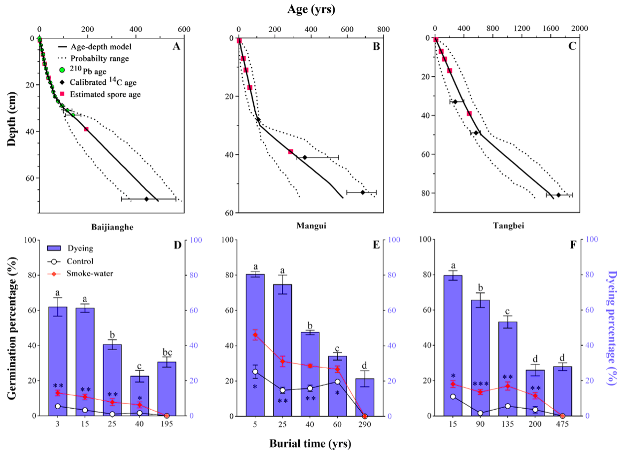 图3. 三个泥炭地的年龄深度模型及烟溶液对埋藏于这些泥炭地的孢子萌发的影响