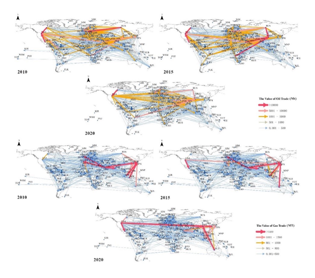 因此,我院魏冶教授课题组基于2010年、2015年和2020年的全球油气资源贸易往来数据构建油气资源贸易网络,借助网络韧性计算方法、模拟攻击、阻塞点识别等方法,以综合的研究框架对全球油气资源贸易网络的结构韧性进行测度。