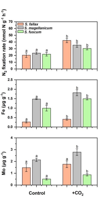 图2. 正常和增加的CO2浓度条件下泥炭藓固氮速率,Fe、Mo元素含量变化
