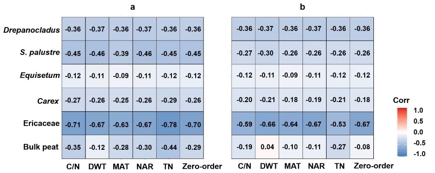 图1. 泥炭剖面所有数据(a)和1860 AD之前的数据(b)的大气CO2浓度和泥炭全样、不同植物的δ15N的偏相关热图