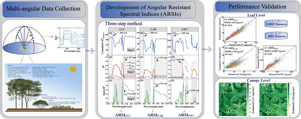 植物叶片的生化参数,如叶绿素(LCC)、类胡萝卜素(CAR)和水含量(EWT),提供了关于光合作用和生理状态的重要信息。光谱指数是估算这些参数的常用方法,但在高空间分辨率数据中,受到随机分布的叶片角度、不断变化的太阳角度和传感器本身较宽的视场角等因素的影响,其精度通常较低。因此,需要开发出能够准确估算生化参数而不受这些因素影响的光谱指数。