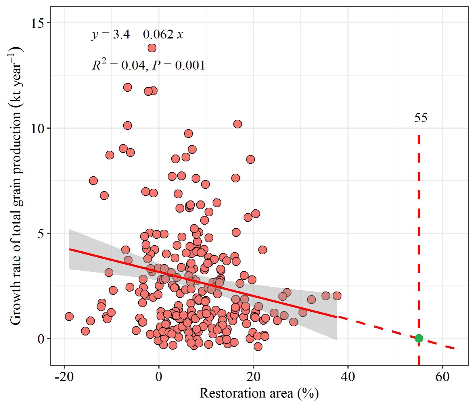 结果表明,1、在经济方面,VRPs提高了县域的GDP,不仅增加了农民的收入来源(包括政府补贴和非农就业),还提高了地方财政(图2,图3)。2、在农业方面,虽然目前VRPs尚未导致农业产量下降,但若恢复面积继续扩大,当超过县域总面积的约55%时,当地粮食安全可能面临风险(图2,图3,图4)。3、在人口方面,VRPs释放了农业劳动力(图2,图3),推动人口向第二产业转移,进而促进了人口流动和产业结构调整。此外,恢复持续时间和面积对农业增长有显著负面影响,但对经济和人口指标的影响不显著。本研究从宏观角度提供了VRPs社会经济影响的系统评估,VRPs在黄土高原地区实现了生态和社会经济的双赢局面,但应在长期推进的同时强化农业基础设施与现代技术,以保障粮食安全。