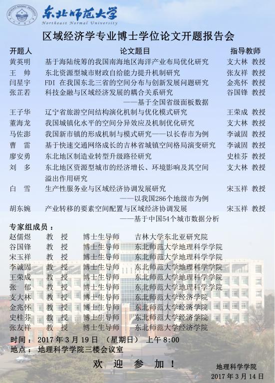 关于2017年上半年区域经济学专业博士学位论文开题报告会的通知