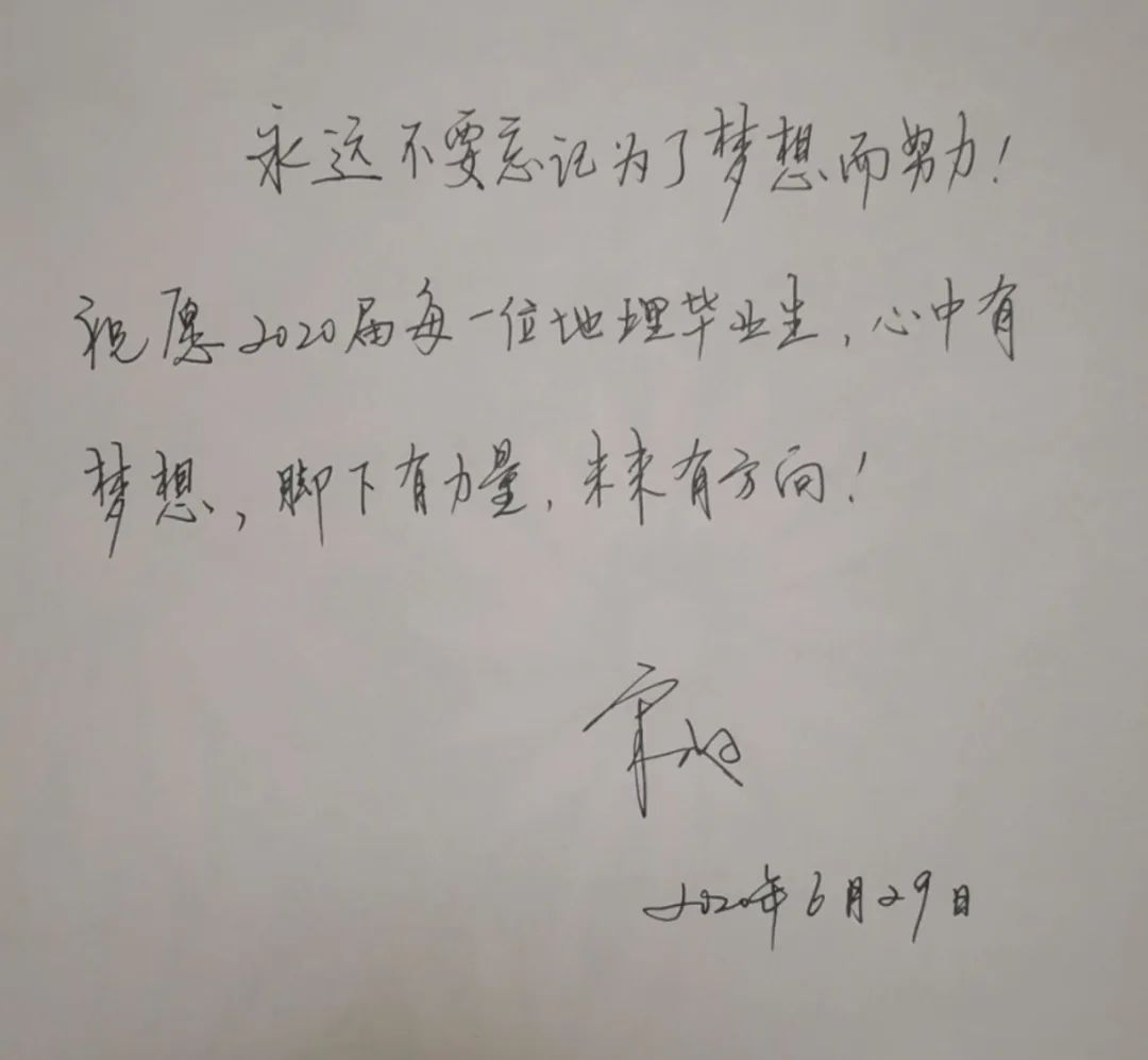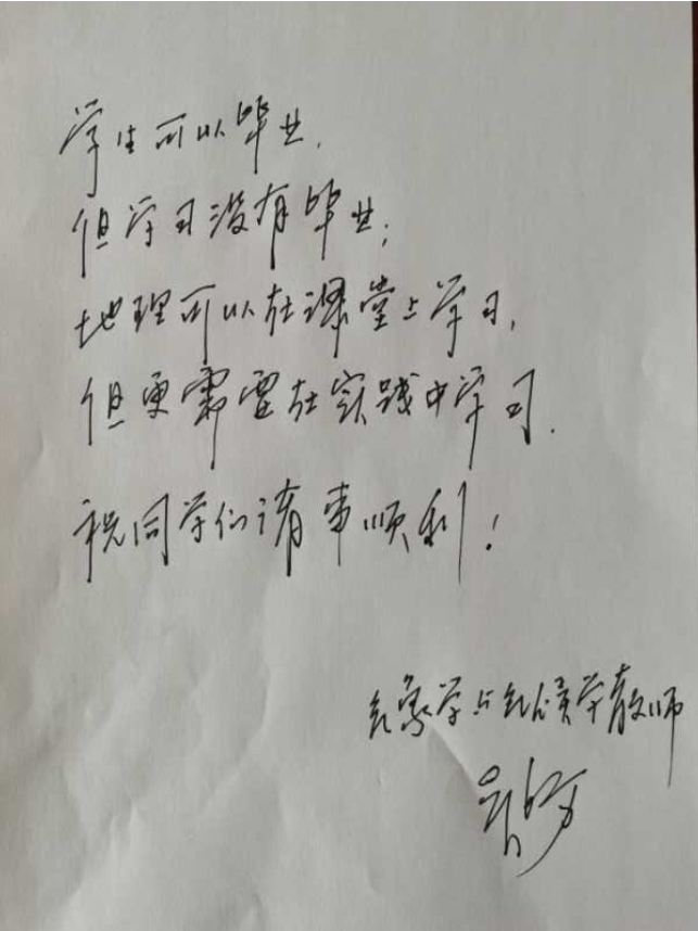 四年地理路,一生地理人。希望你们用地理人的宽广胸襟、丰富知识和脚踏实地的精神去探索和面对多姿多彩人生,去建设和改造美丽富饶的祖国。今天你们扬帆起航,前往人生新的阶段,愿你们前程似锦!