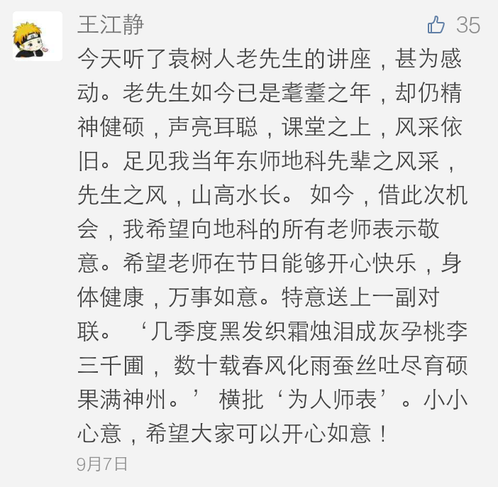 本次活动通过东师地科的微信平台进行宣传,在教师节这个特别的节日给老师们献上了一份别致而又走心的礼物。同学们积极参与了本次留言征集活动,据统计,有近40条留言被地科君移入了精选。其中,有听了袁树人老先生的讲座后受到启发写给袁树人老先生的;有为了表达对老师的崇拜和尊敬写给孙仲秋老师的;还有被杨老师幽默生动的讲课风格折服的同学写给杨令宾老师的等等。