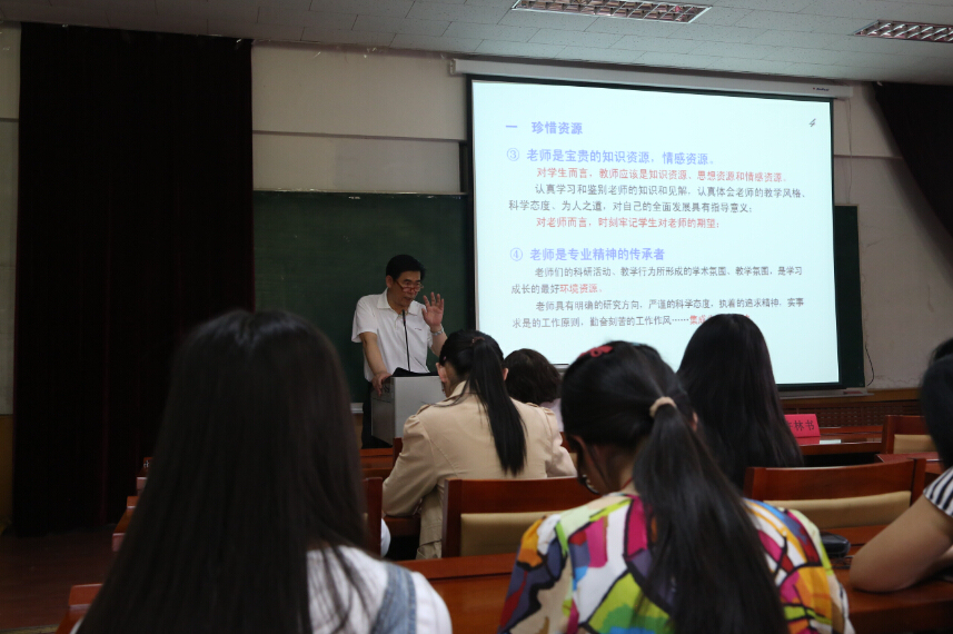 今天许林书老师开讲的主题是“珍惜人生,科学成长”,首先,许老师向同学们介绍了A4纸上的人生,并展示了自己人生的A4纸,以独特的方式劝诫同学们要珍惜时间,珍惜青春,在年轻的时候要尽可能地、科学地、快速地、全面地提高自己,让思想与情感充满正能量,为国家、为社会做更大的贡献。然后许老师根据自己不同阶段的人生经历从以下三个方面告诉同学们优秀教师该如何度过人生:珍惜资源,包括时间资源、知识资源等;技不压身,拓宽学术视野,工作学习化;德行天下,增强责任感,实践教师的使命。最后许老师还通过讲述他的一些亲身经历,告诫同学们学习来不得半点马虎,半点骄傲。同学们也从风趣幽默的许老师那里得到了宝贵的知识,收获颇丰。