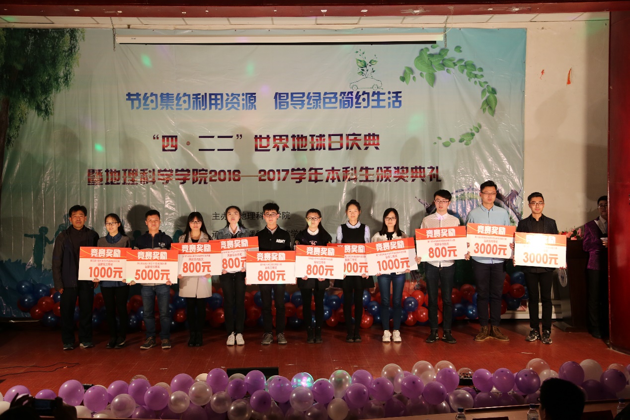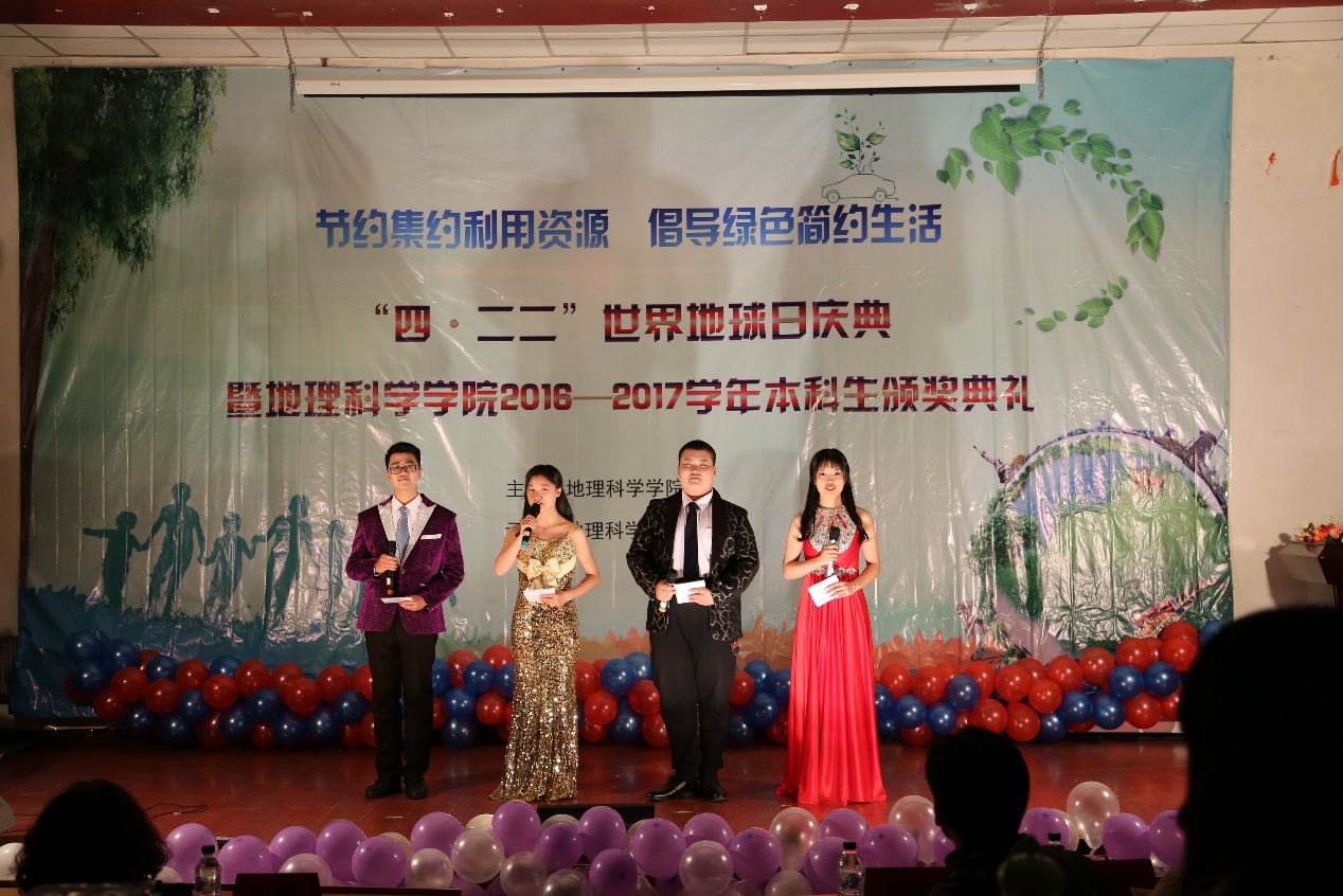 4月22日,由地理科学学院学生会主办的“节约集约利用资源,倡导绿色简约生活”四·二二世界地球日庆典暨2016-2017学年本科生颁奖典礼在逸夫科技馆一楼半落下帷幕。本次活动获得了领导们的积极关注及同学们的热烈反响。出席本次活动的嘉宾有东北师范大学学生处副处长孔洁珺、东北师范大学学生处副处长李中原、地理科学学院党委副书记副院长陈静、地理科学学院副院长卜兆君、地理科学学院地理科学系系主任娄晓黎、地理科学学院自然地理与资源环境系系主任李鸿凯、地理科学学院团委书记沈雯、地理科学学院2013级辅导员赵琳、地理科学学院2014级辅导员张泽远、地理科学学院2015级辅导员房栋和地理科学学院2016级辅导员张婧宁。